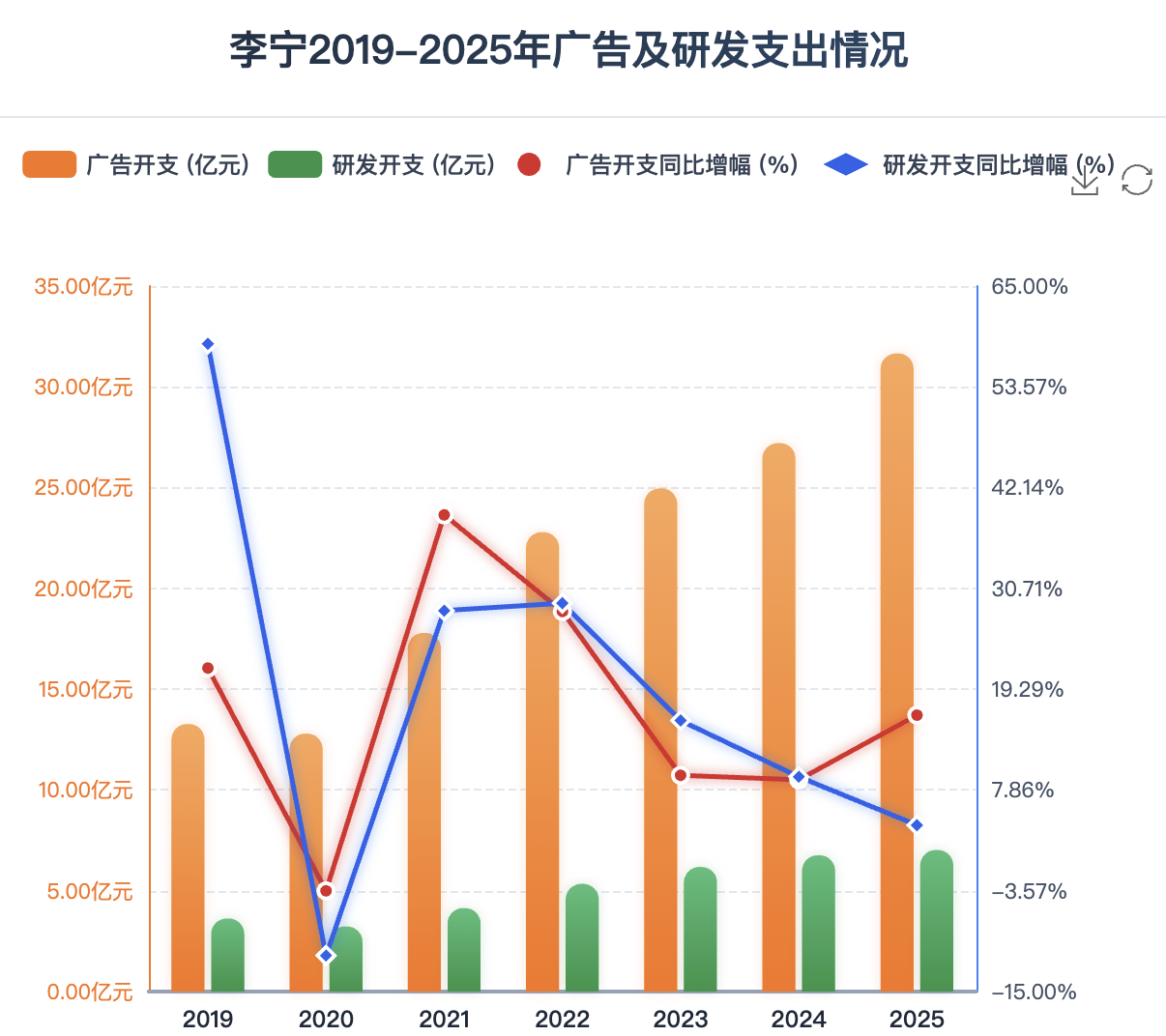 另外,新京报贝壳财经记者注意到,为强化品牌竞争力,策略性增加奥运营销投入,李宁2025年的广告及市场推广占收入比重由9.5%提升至10.7%,实际投入突破30亿元,同比增长16.34%。