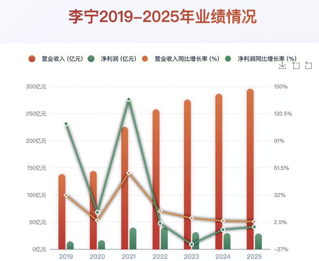 这一年,李宁以295.98亿元的营收同比增长3.2%,创下历史新高,交出了一份稳健的成绩单。