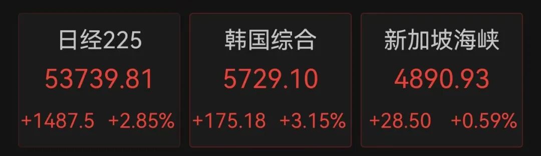 亚洲市场早盘走强。Wind数据显示,截至北京时间3月25日9:50,韩国综合指数上涨3.15%,报5729.10点;日经225指数上涨2.85%,报53739.81点。