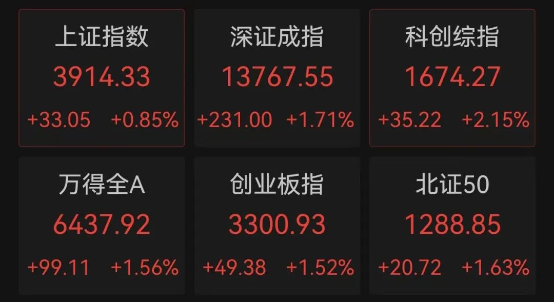 Wind数据显示,截至北京时间3月25日9:50,上证指数涨幅扩大至0.85%,收复3900点;深证成指和创业板指均涨超1%,科创综指涨超2%。港股方面,截至9:54,恒生指数、恒生科技指数均涨超1%。