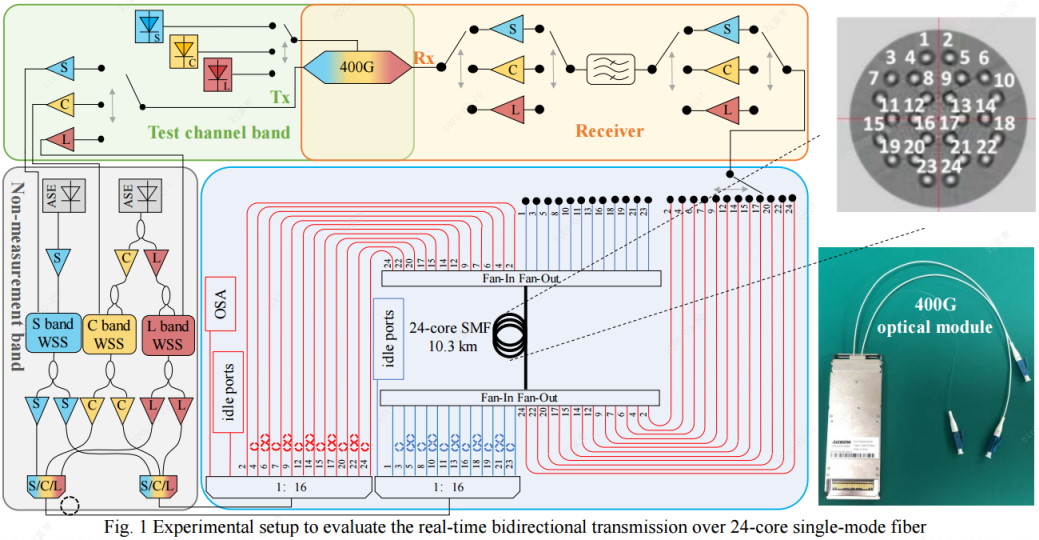 在前期研究中,团队已在多芯光纤与扩展波段实时传输方面取得多项成果。在此基础上,实验系统整体采用“多波段光源+商用一体化相干光模块+多芯光纤传输”的架构,实现超大容量实时双向传输。