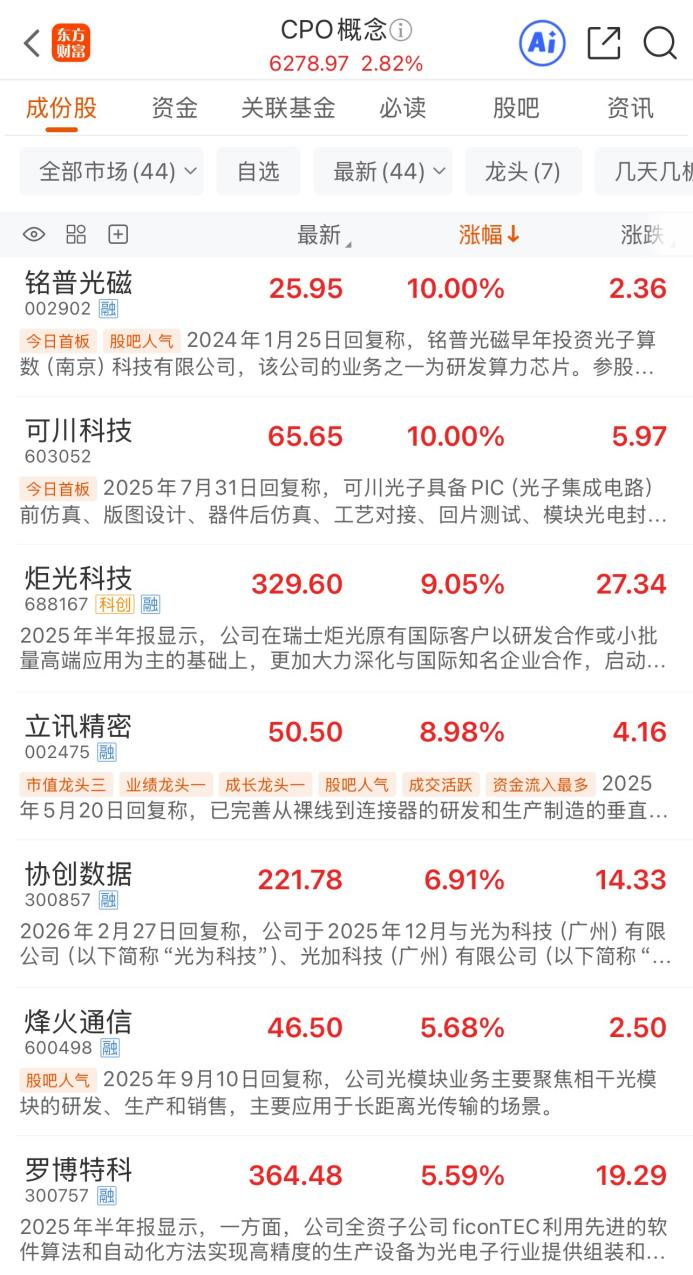 CPO概念再度活跃。3月25日早盘,CPO概念高开高走,截至早间收盘,板块上涨2.82%,涨幅居市场概念板块前列。个股方面,铭普光磁、可川科技涨停,炬光科技、立讯精密暴涨9%,协创数据、烽火通信、罗博特科、天孚通信、亨通光电、德科立等多股涨超5%。