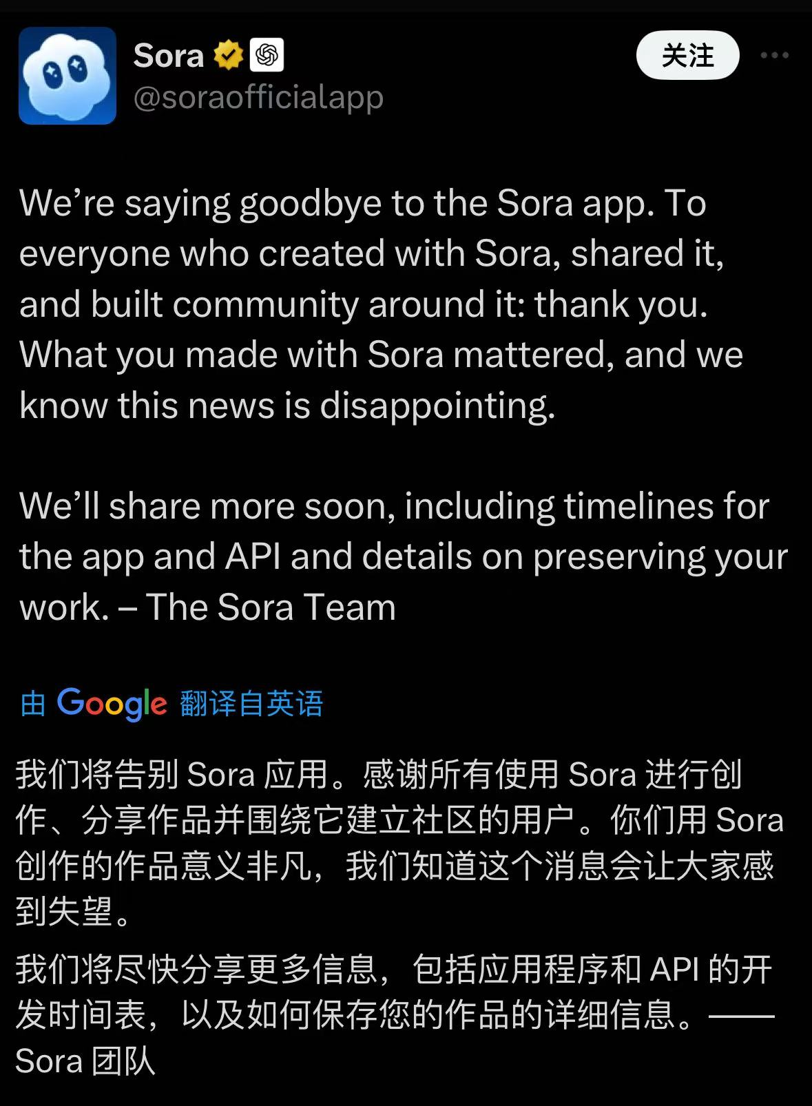 Sora团队称:“感谢所有使用Sora进行创作、分享作品并围绕它建立社区的用户。你们用 Sora创作的作品意义非凡,我们知道这个消息会让大家感到失望。我们将尽快分享更多信息,包括应用程序和API的开发时间表,以及如何保存您的作品的详细信息。”