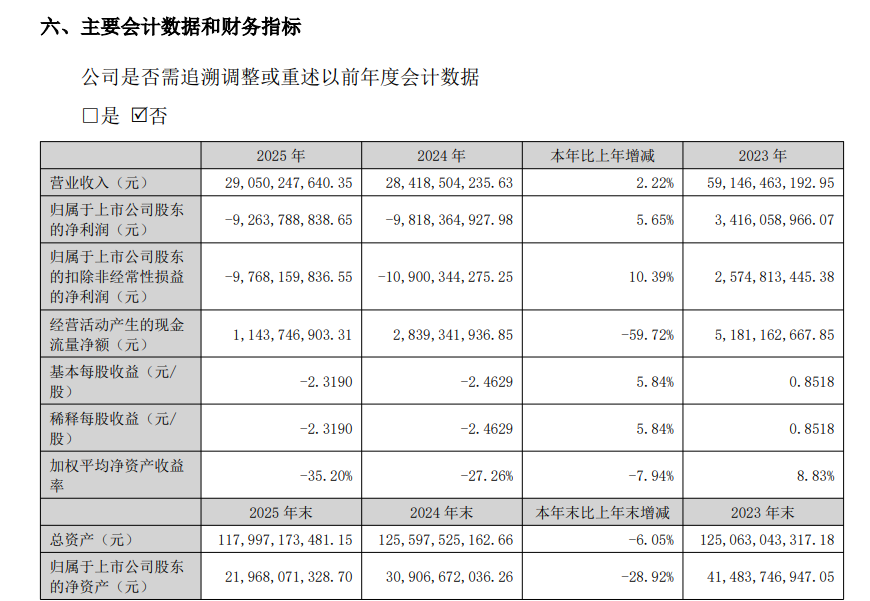 3月24日晚间,TCL中环发布了2025年年度报告。报告显示,公司2025年实现营业收入290.50亿元,同比微增2.22%;但归属于上市公司股东的净利润为-92.64亿元,虽较2024年的-98.18亿元减亏5.65%,亏损额依然触目惊心。