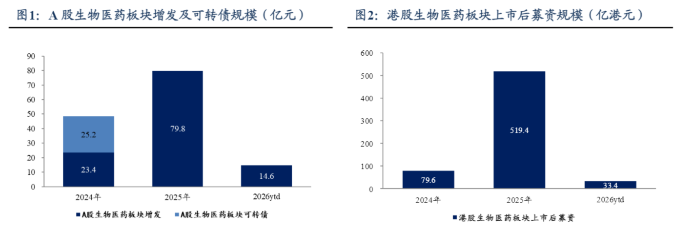 2024/1/1-2026/3/21,港股及A股生物医药板块上市后募资约700亿元,支持创新药管线研发投入。据统计,2024/1/1-2026/3/21,A股生物医药板块通过增发融资总额为118亿元,通过发行可转债融资总额为25亿元。2024/1/1-2026/3/21,港股生物医药板块上市后募资总额为632亿港币。