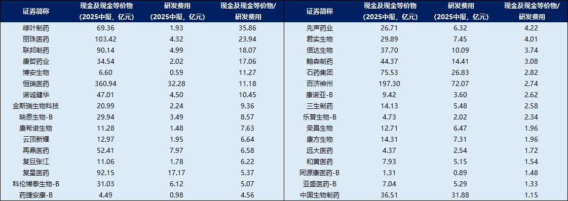 医药板块资金充裕,研发可持续性坚实。东吴证券通过计算“现金及现金等价物/年研发费用”来评估创新药板块的资金面是否充裕。整体而言,当前医药板块资金面充裕,绝大多数企业仍保持了1年以上的研发资金覆盖能力,能够有效支撑后续临床试验推进、管线拓展及技术创新,为行业长期高质量发展奠定了稳健的财务基础,也为创新药企业的技术突破与商业化转化提供了充足的时间窗口。