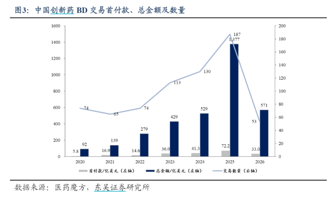 BD收入成为创新药研发资金重要来源。截至2026/3/21,2026年中国创新药出海BD总包已经达571亿美元,首付33亿美元,数量达53件。总包相当于25年全年的41%(25年全年总包为1377亿美元),超过24年全年水平(24年全年总包为529亿美元),首付金额达33亿美元,相当于25年全年的46%。在国内工程师红利、庞大患者池、政策支持下,东吴证券认为中国创新药出海是长周期产业趋势,坚定看好26年BD持续兑现!