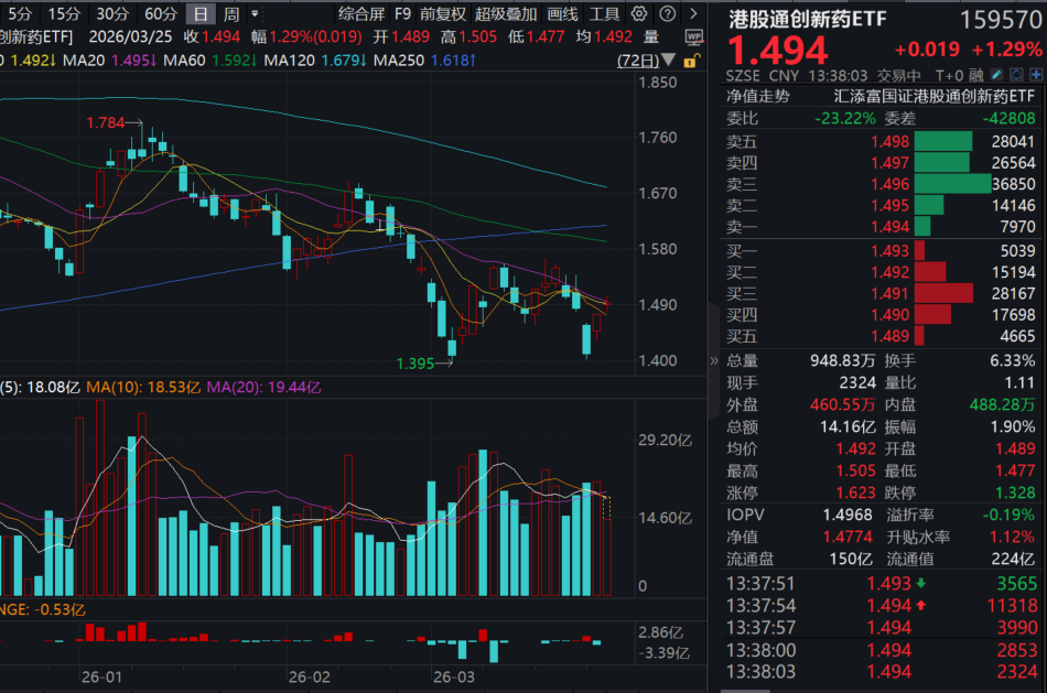 今日(3.25),港药连续第二日反弹,创新药纯度100%的港股通创新药ETF(159570)涨超1%,盘中成交额快速突破15亿元!资金近3日有2日净流入,累计“吸金”2200万元!最新规模超221亿元,同类遥遥领先。