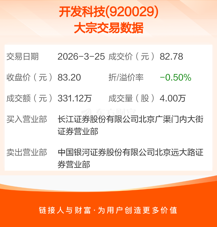 2026年3月25日,开发科技发生1笔大宗交易,共成交4.00万股,成交金额331.12万元,占其流通市值比例为0.10%。