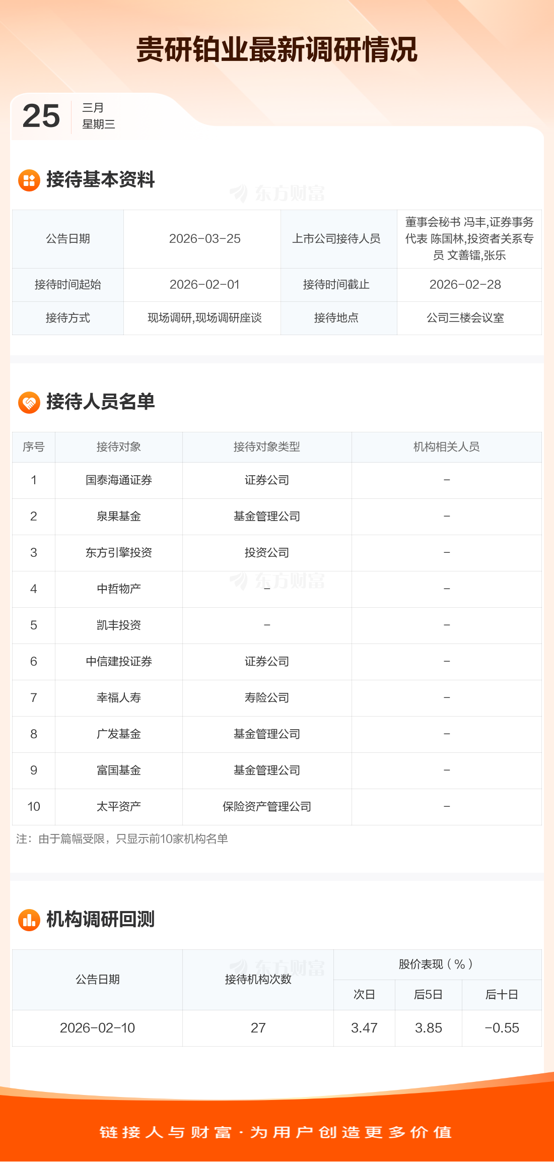 贵研铂业3月25日公告称,2月1日至2月28日接待国泰海通证券等13家机构调研。接待人员包括董事会秘书 冯丰,证券事务代表 陈国林,投资者关系专员 文善镭,张乐。
