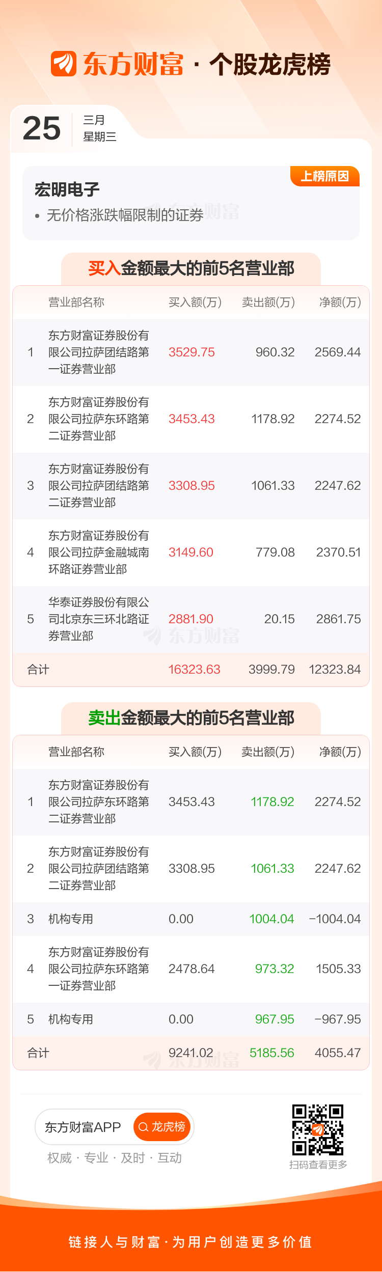 交易所2026年3月25日公布的交易公开信息显示,宏明电子因成为无价格涨跌幅限制的证券上榜。宏明电子当日收报128.65元,涨跌幅84.68%,换手率76.59%,成交额26.63亿。