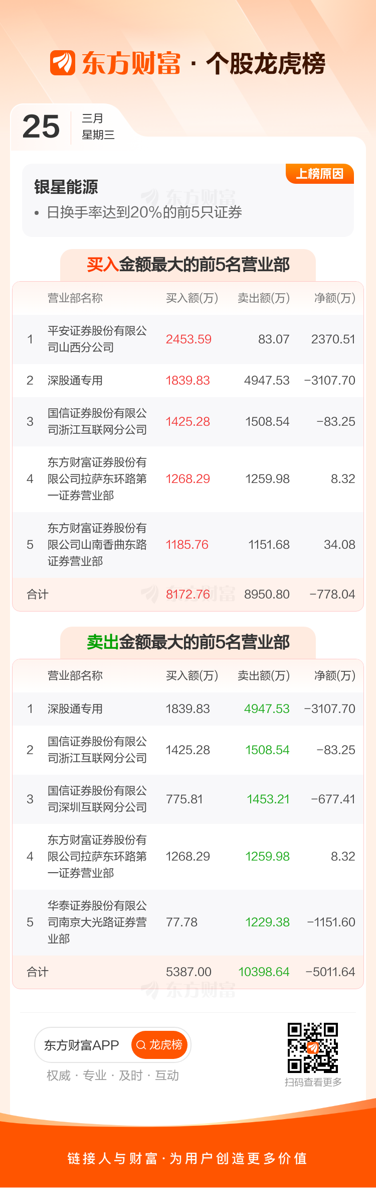 交易所2026年3月25日公布的交易公开信息显示,银星能源因成为日换手率达到20%的前5只证券上榜。银星能源当日收报8.84元,涨跌幅-1.89%,偏离值28.10%,换手率28.10%,成交额15.86亿。