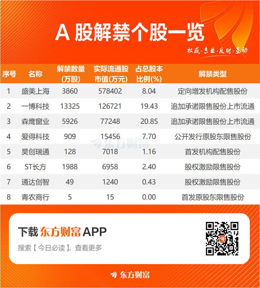从解禁市值看,东方财富Choice数据显示,明日面临解禁的8只股票中,盛美上海、一博科技、森鹰窗业居前,解禁市值分别为57.84亿元、12.67亿元、7.72亿元。解禁比例方面,森鹰窗业、一博科技、盛美上海分别为20.85%、19.43%、8.04%,居于前列。
