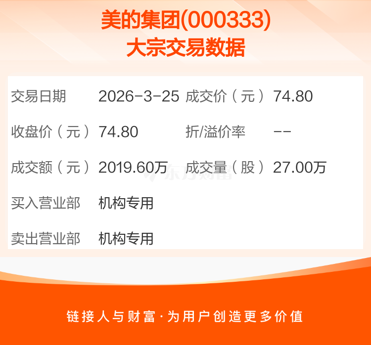 2026年3月25日,美的集团发生1笔大宗交易,共成交27.00万股,成交金额2019.60万元。