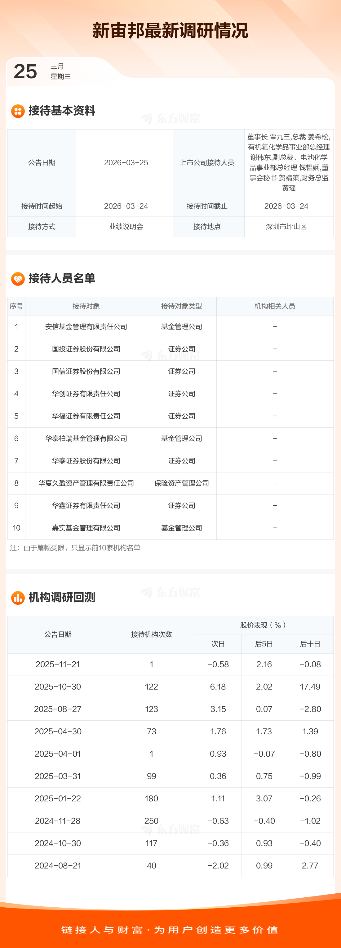 新宙邦3月25日公告称,3月24日接待安信基金管理有限责任公司等55家机构调研。接待人员包括董事长 覃九三,总裁 姜希松,有机氟化学品事业部总经理 谢伟东,副总裁、电池化学品事业部总经理 钱韫娴,董事会秘书 贺靖策,财务总监 黄瑶。