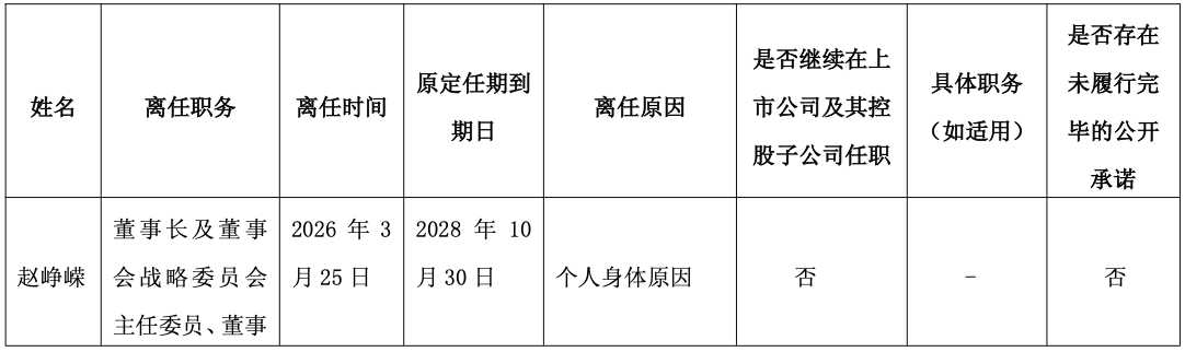 3月25日,新黄浦(600638)公告,因个人身体原因,公司董事长赵峥嵘申请辞去公司董事长、董事会战略委员会主任委员、董事职务。其原定任期到期日为2028年10月30日,赵峥嵘离任后不继续在公司及其控股子公司任职。