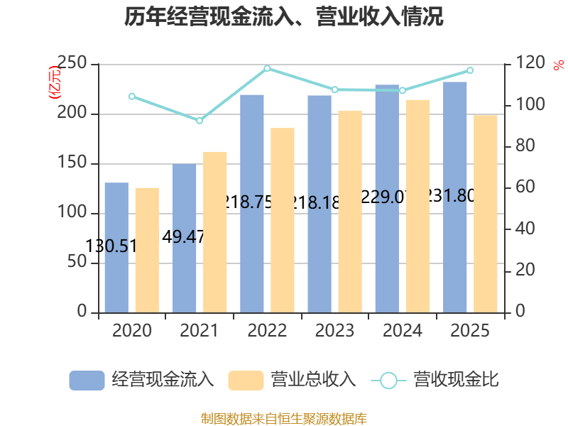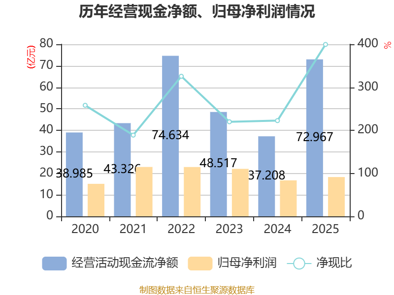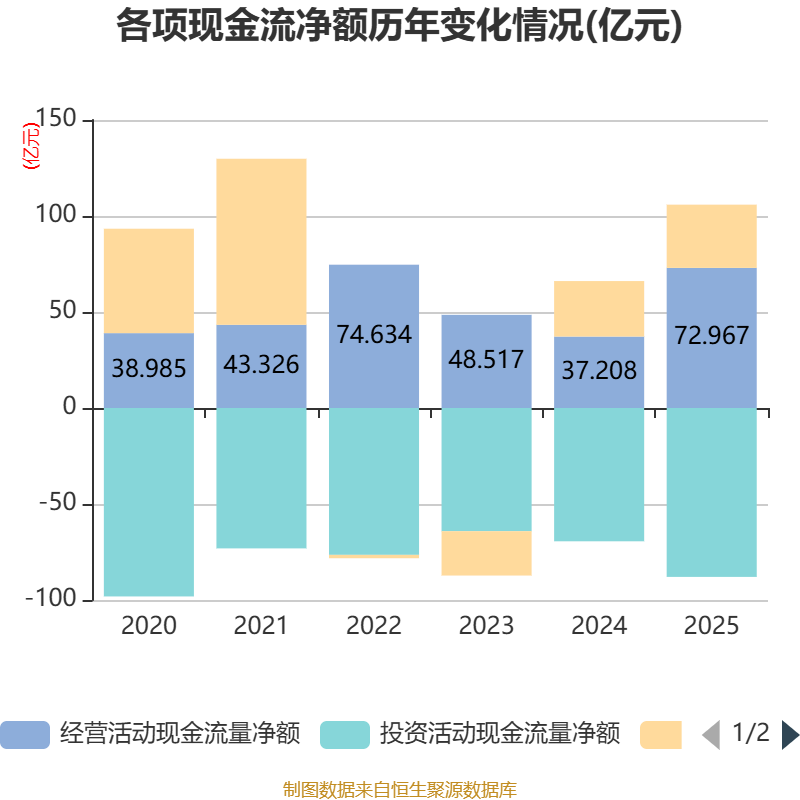 截至2025年,公司经营活动现金流净额为72.97亿元,同比增长96.11%;筹资活动现金流净额32.94亿元,同比增加4.03亿元;投资活动现金流净额-87.97亿元,上年同期为-69.42亿元。