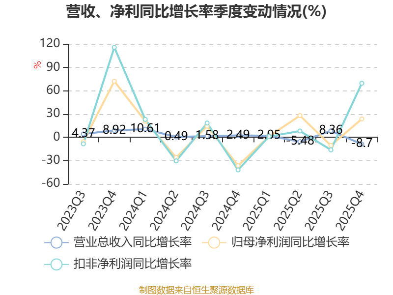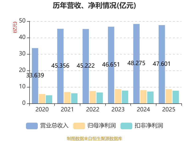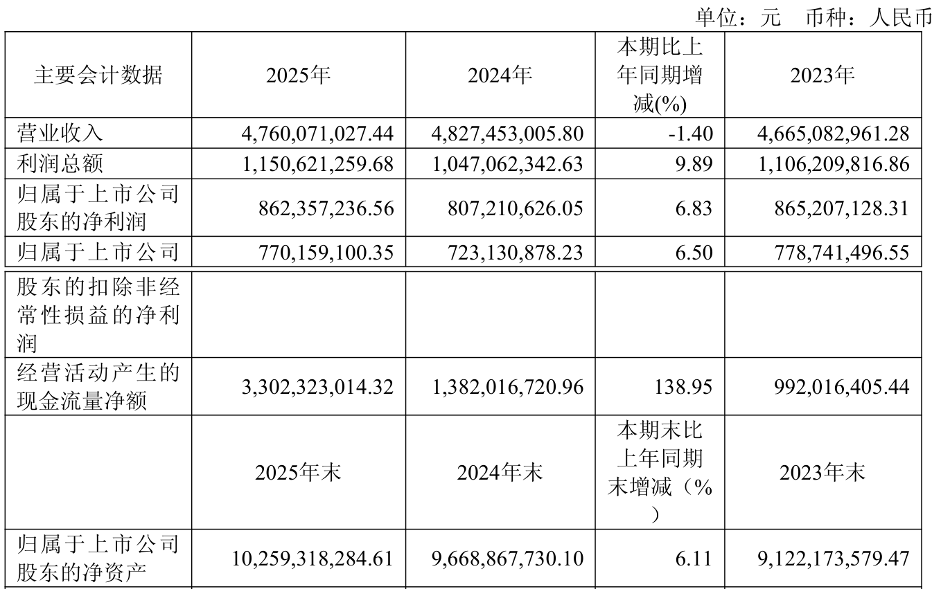 中证智能财讯创业环保(600874)3月26日披露2025年年度报告。2025年,公司实现营业总收入47.6亿元,同比下降1.40%;归母净利润8.62亿元,同比增长6.83%;扣非净利润7.7亿元,同比增长6.50%;经营活动产生的现金流量净额为33.02亿元,同比增长138.95%;报告期内,创业环保基本每股收益为0.55元,加权平均净资产收益率为8.65%。公司2025年度分配预案为:拟向全体股东每10股派现2.09元(含税)。