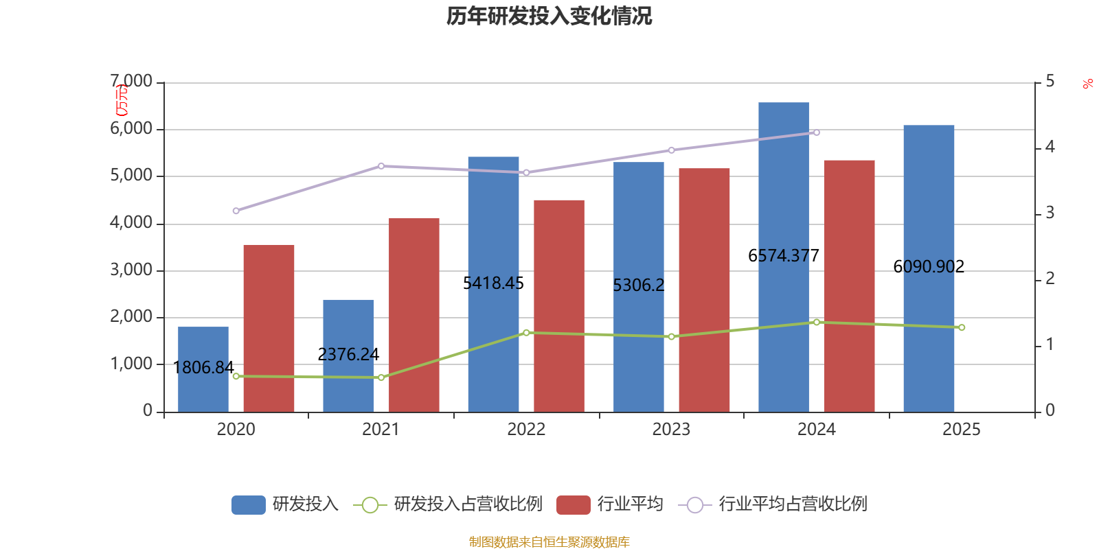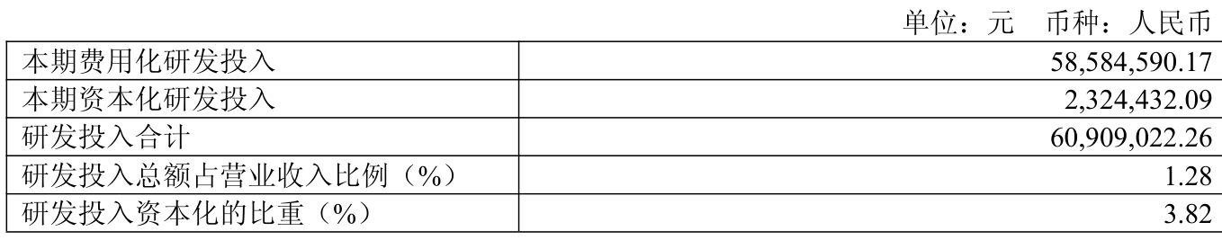 2025年全年,公司研发投入金额为6090.9万元,同比下降7.35%;研发投入占营业收入比例为1.28%,相比上年同期下降0.08个百分点。此外,公司全年研发投入资本化率为3.82%。
