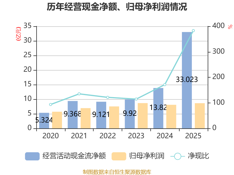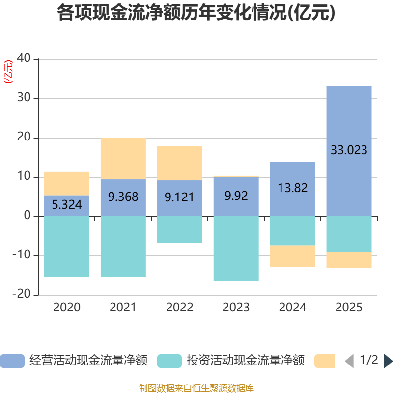 截至2025年,公司经营活动现金流净额为33.02亿元,同比增长138.95%;筹资活动现金流净额-4.13亿元,同比增加1.29亿元;投资活动现金流净额-9.11亿元,上年同期为-7.45亿元。