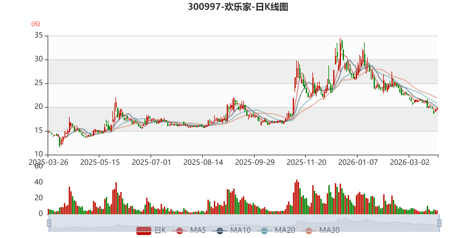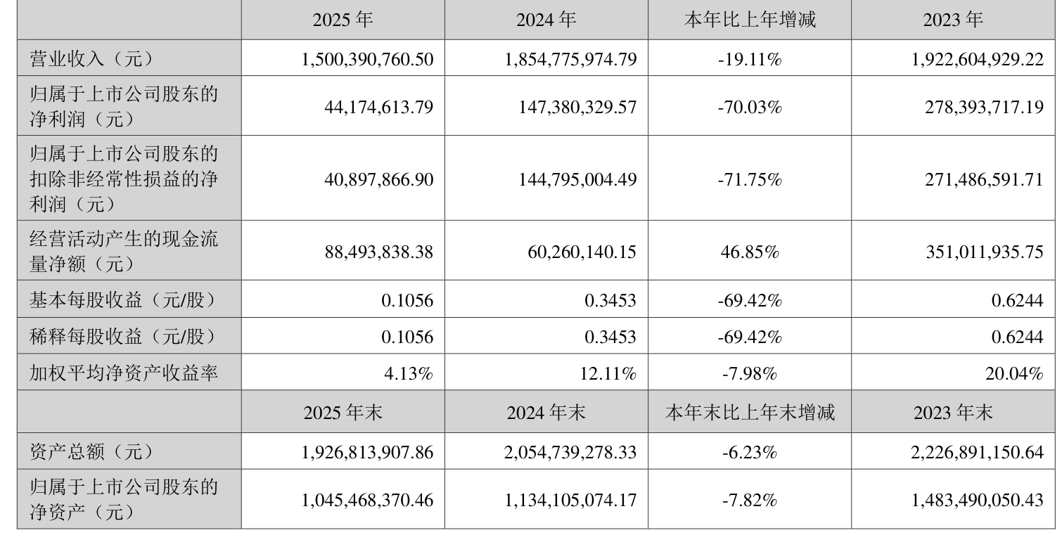 中证智能财讯欢乐家(300997)3月26日披露2025年年度报告。2025年,公司实现营业总收入15亿元,同比下降19.11%;归母净利润4417.46万元,同比下降70.03%;扣非净利润4089.79万元,同比下降71.75%;经营活动产生的现金流量净额为8849.38万元,同比增长46.85%;报告期内,欢乐家基本每股收益为0.1056元,加权平均净资产收益率为4.13%。公司2025年度分配预案为:拟向全体股东每10股派现2元(含税)。