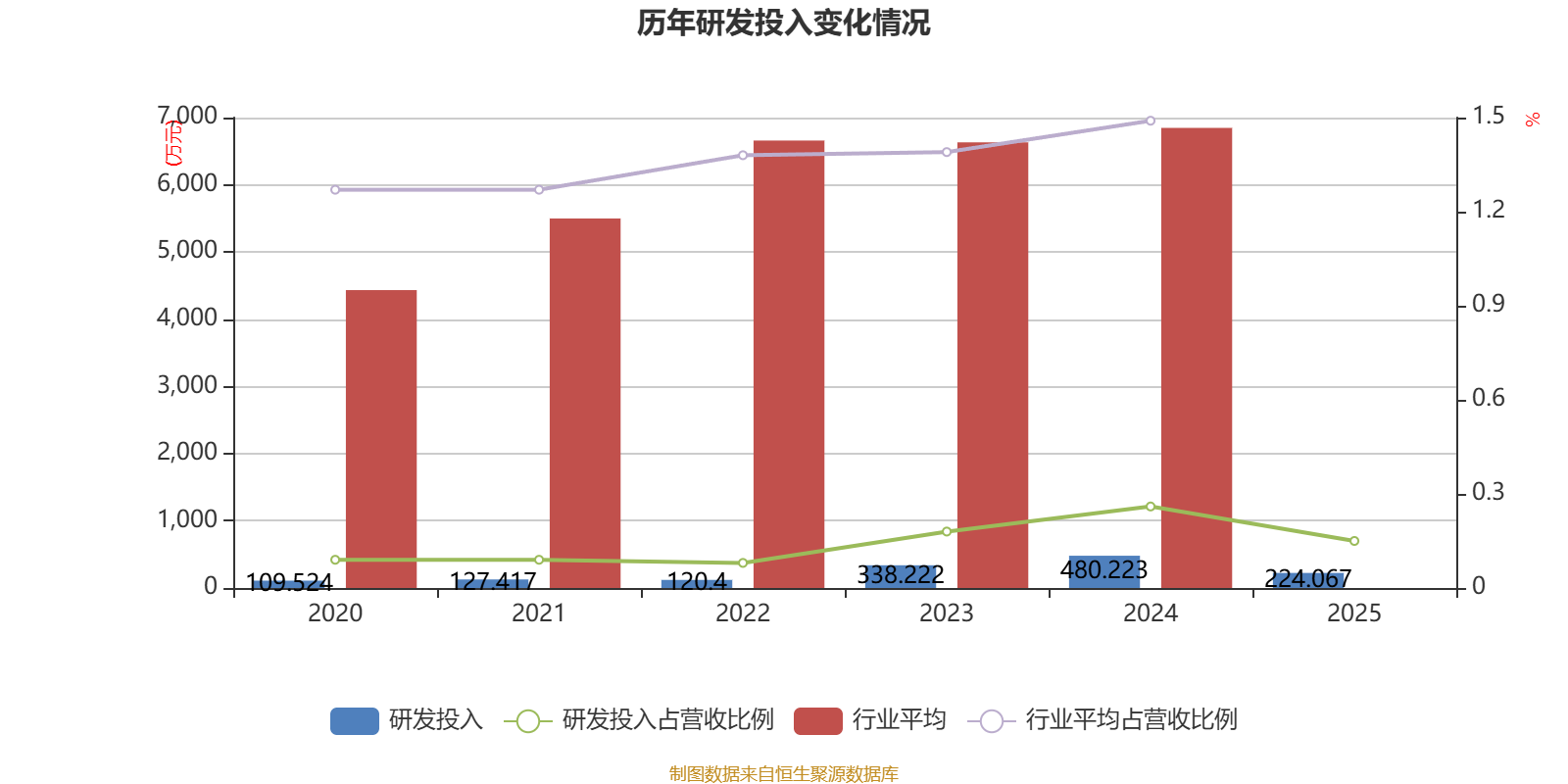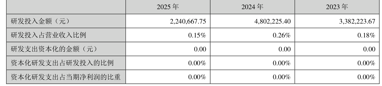 2025年全年,公司研发投入金额为224.07万元,同比下降53.34%;研发投入占营业收入比例为0.15%,相比上年同期下降0.11个百分点。此外,公司全年研发投入资本化率为0%。