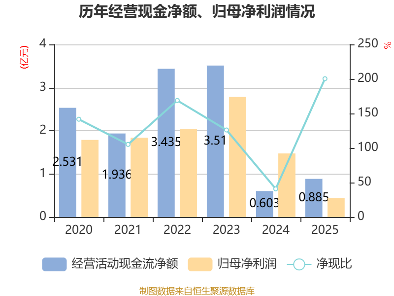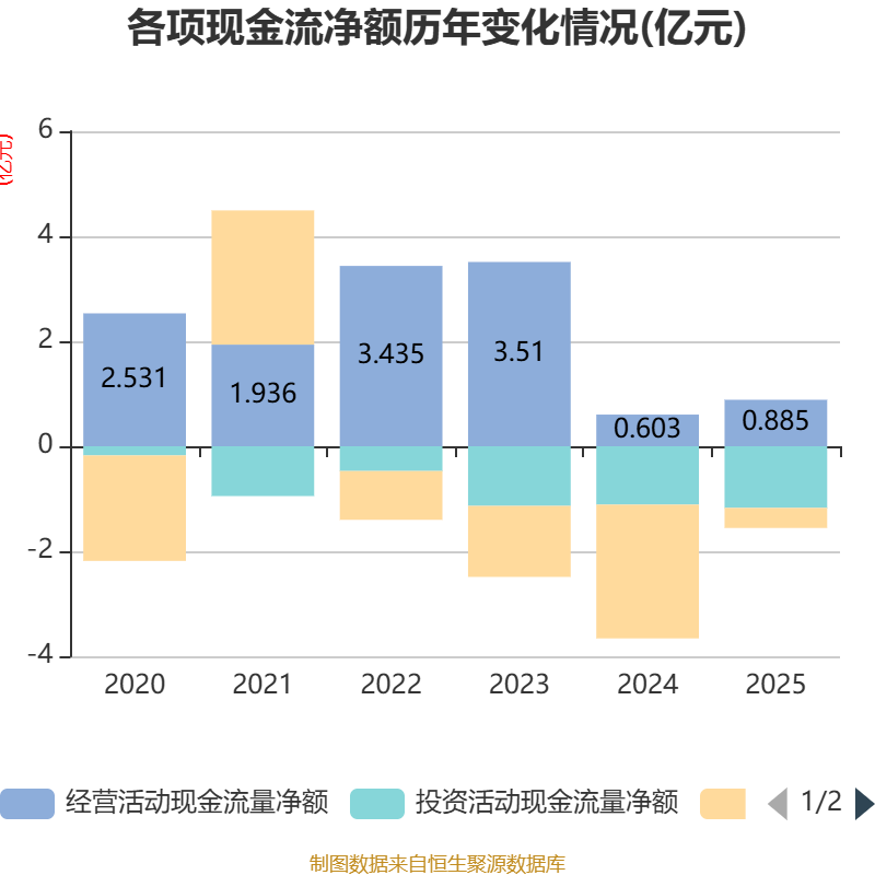截至2025年,公司经营活动现金流净额为8849.38万元,同比增长46.85%;筹资活动现金流净额-3826.5万元,同比增加2.17亿元;投资活动现金流净额-1.17亿元,上年同期为-1.11亿元。