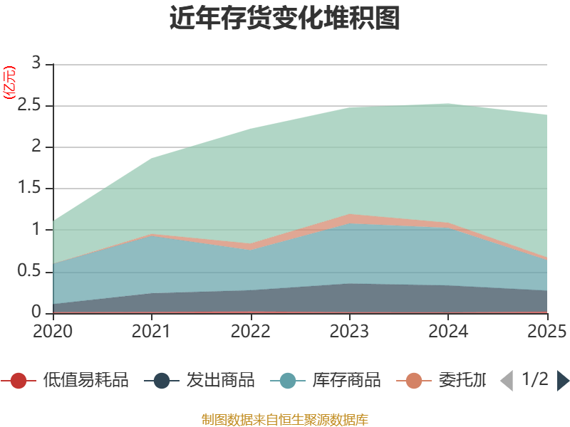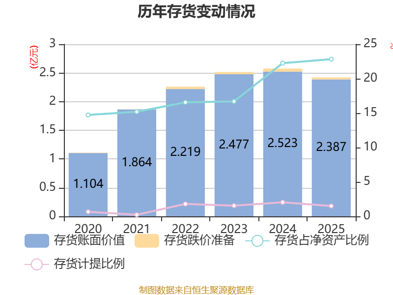 从存货变动来看,截至2025年末,公司存货账面价值为2.39亿元,占净资产的22.83%,较上年末减少1365.72万元。其中,存货跌价准备为363.17万元,计提比例为1.5%。