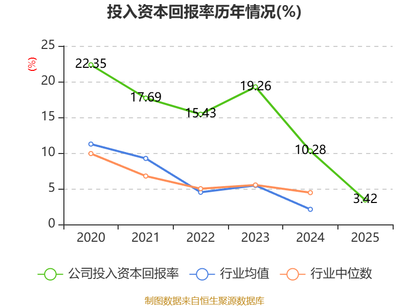 数据显示,2025年公司加权平均净资产收益率为4.13%,较上年同期下降7.98个百分点。公司2025年投入资本回报率为3.42%,较上年同期下降6.86个百分点。