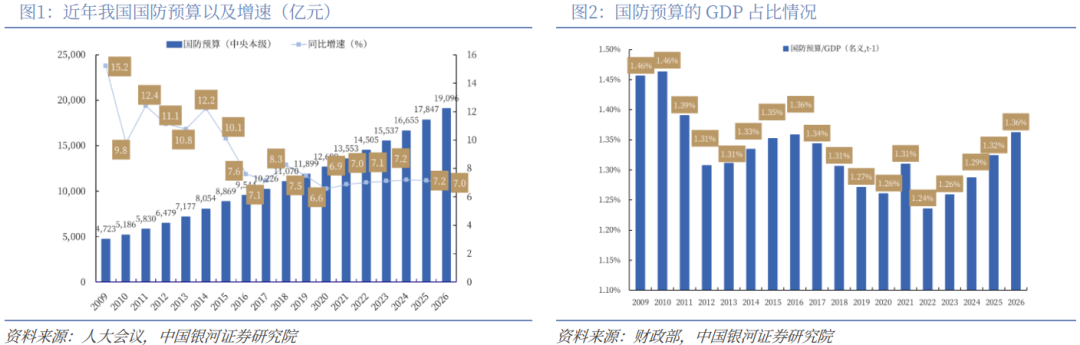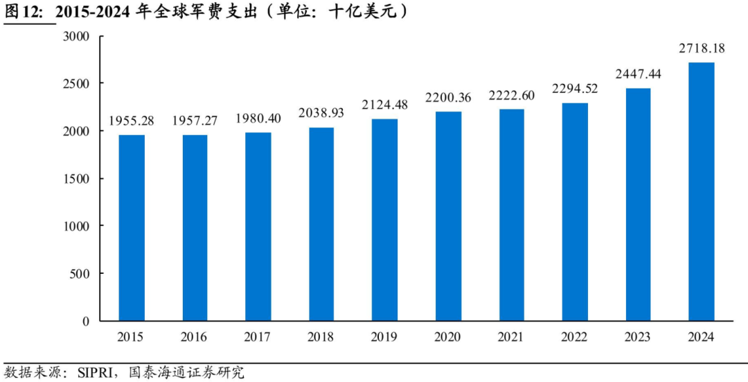 近年来,我国国防预算增幅长期维持在7%左右,国防支出占GDP的比重不到1.5%,低于世界主要军事大国的平均水平。我们认为,我国国防支出仍有较大增长空间,未来或长期高于GDP增速2个百分点左右。随着现代战争形态向信息化、智能化加速演进,未来我国国防支出结构将向新域新质方向倾斜,而且军贸出口有望打开更大市场空间。