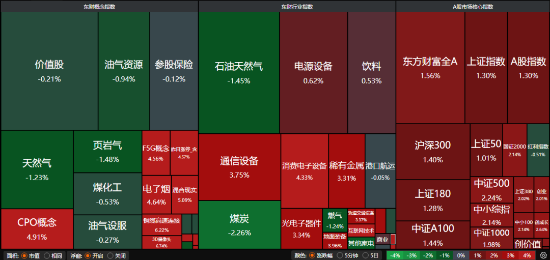 A股三大指数昨日集体上涨,沪指涨1.30%,深证成指涨1.95%,创业板指涨2.01%。沪深京三市成交额2.19万亿。行业板块几乎全线上扬,电力、通信设备、稀土、通信服务、贵金属、酒店餐饮、能源金属、旅游景区、航空机场板块涨幅居前,仅光伏设备板块逆市微跌。