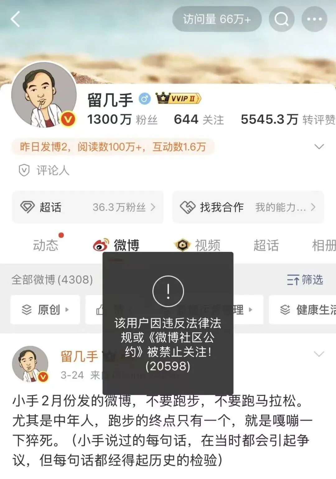 3月26日,千万粉丝大V留几手微博账号被禁止关注,上一条微博3月24日发布,提醒不要跑步,不要跑马拉松。