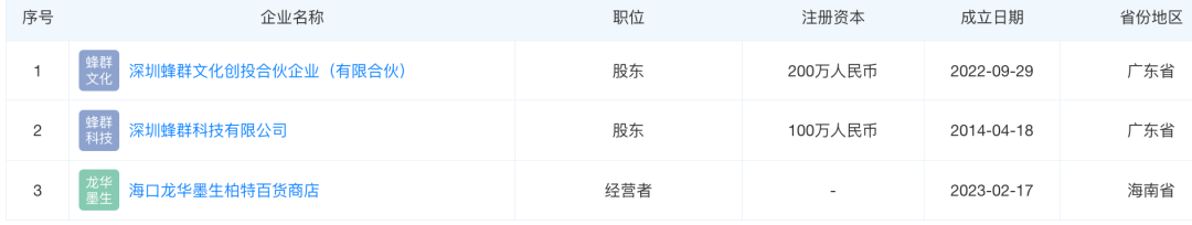 天眼查显示,留几手(本名刘爽)持有蜂群两家公司的股权,分别为深圳蜂群科技有限公司(5%)、深圳蜂群文化创投合伙企业(有限合伙)(15%)。其中,深圳蜂群科技有限公司成立于2014年,该公司于2023年7月被列入经营异常。