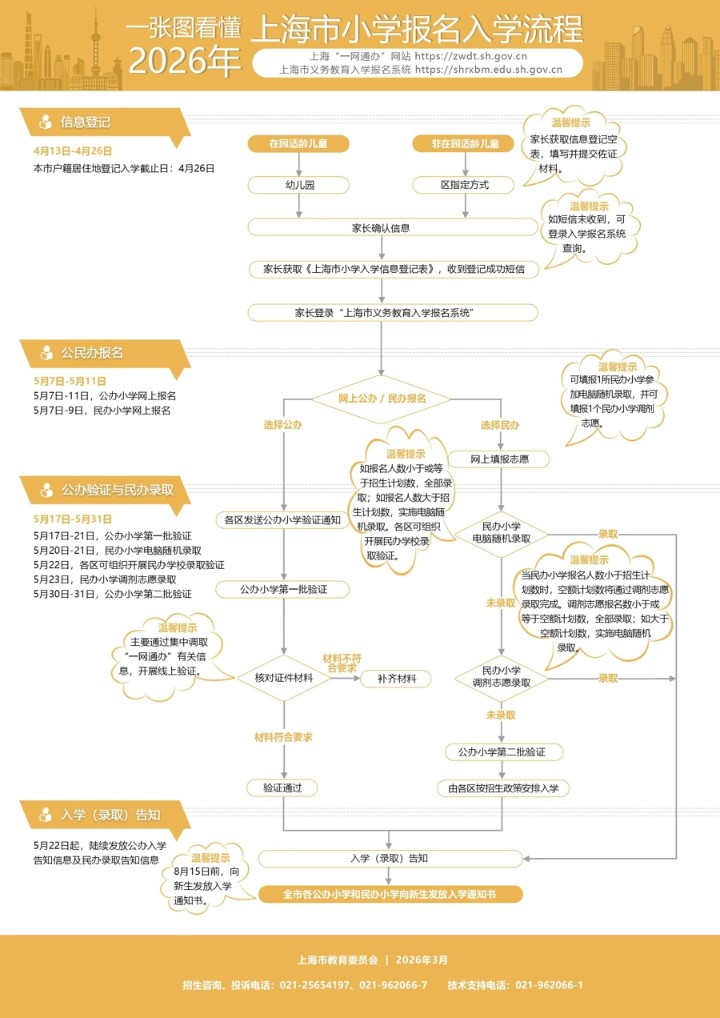4月7日,各区将公布义务教育学校招生工作实施方案和招生细则。4月13日前,各区将组织幼儿园大班家长会和小学毕业班家长会,具体解读今年义务教育招生政策。