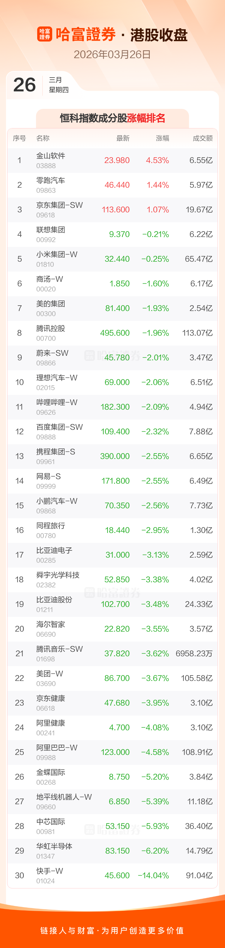 港股3月26日收盘走低 ,恒生指数收报24856.43点,跌479.52点,跌幅1.89%;恒生科技指数收报4761.54点,跌161.4点,跌幅3.28%。恒生指数成分股中蒙牛乳业、中国海洋石油、中国石油股份涨幅居前,快手-W、泡泡玛特、中国人寿跌幅靠前。恒生科技指数成分股中金山软件、零跑汽车、京东集团-SW涨幅居前,快手-W、华虹半导体、中芯国际跌幅靠前。