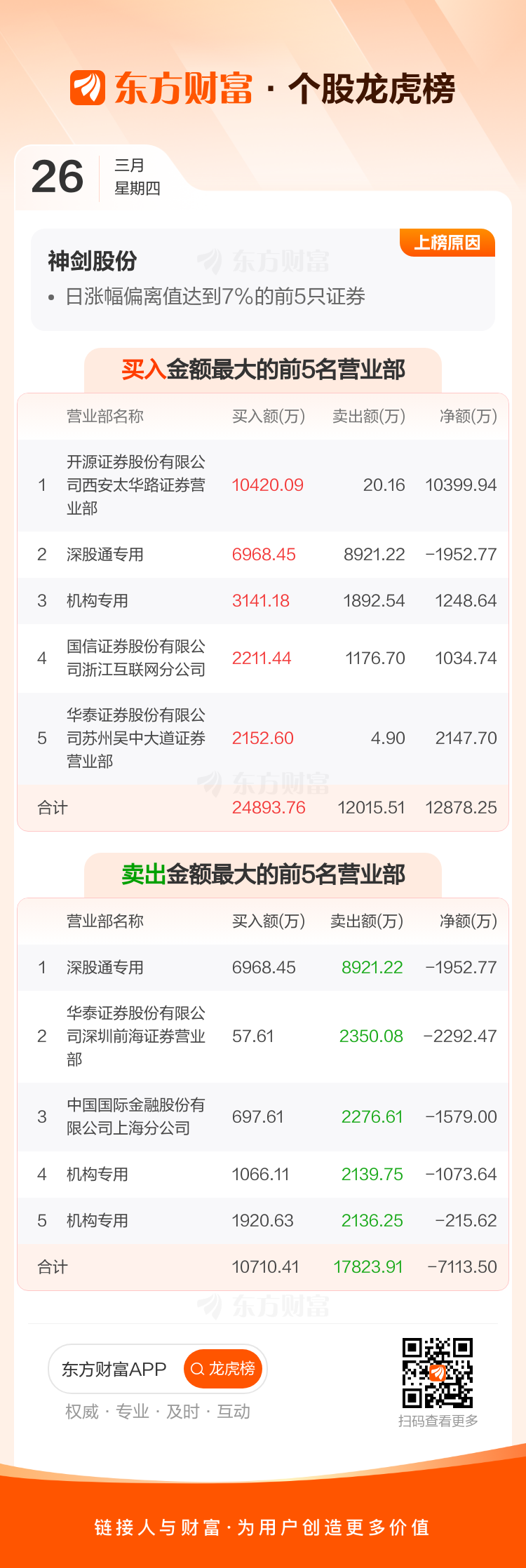 交易所2026年3月26日公布的交易公开信息显示,神剑股份因成为日涨幅偏离值达到7%的前5只证券上榜。神剑股份当日收报12.4元,涨跌幅10.03%,偏离值11.46%,换手率19.54%,成交额18.76亿。