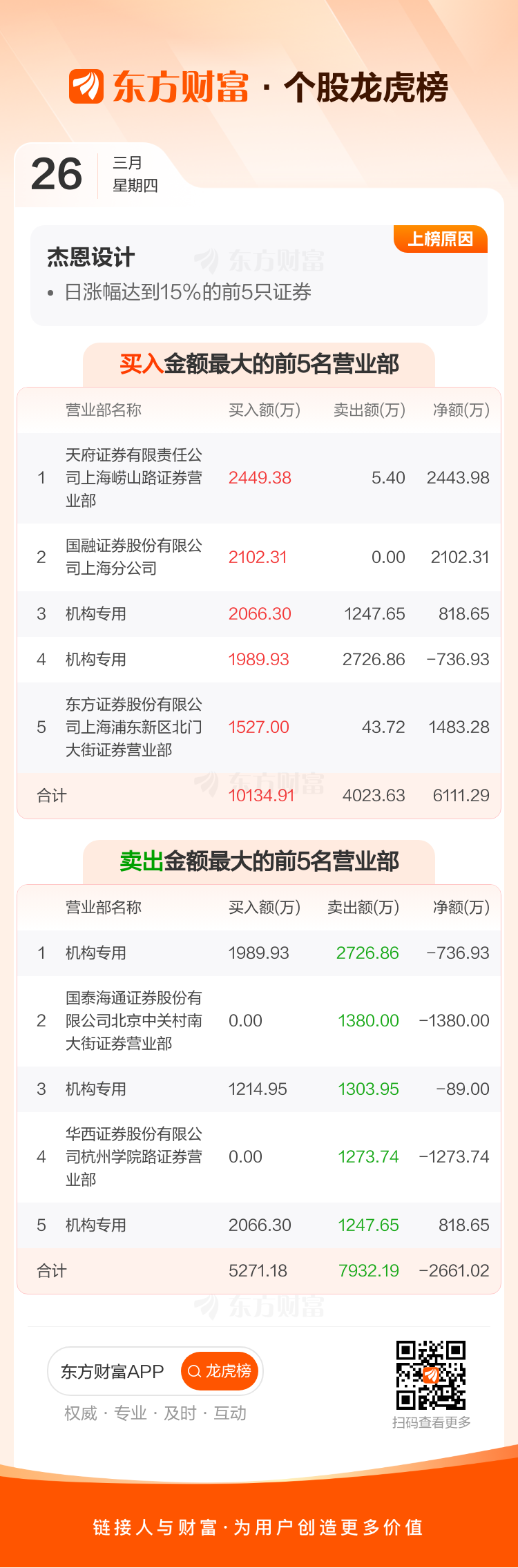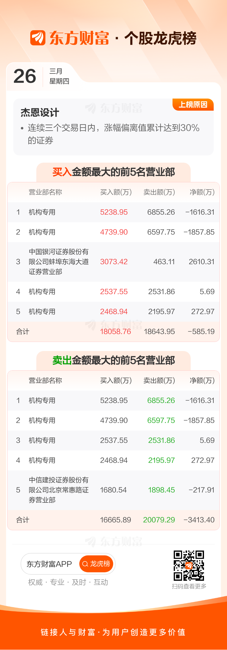 交易所2026年3月26日公布的交易公开信息显示,杰恩设计因成为日涨幅达到15%的前5只证券、连续三个交易日内,涨幅偏离值累计达到30%的证券上榜。杰恩设计当日收报42.65元,涨跌幅18.47%,偏离值18.47%,换手率16.32%,成交额6.52亿。异常期间3月24日至3月26日,期间涨幅42.45%,累计偏离值40.37%,区间成交额13.06亿。