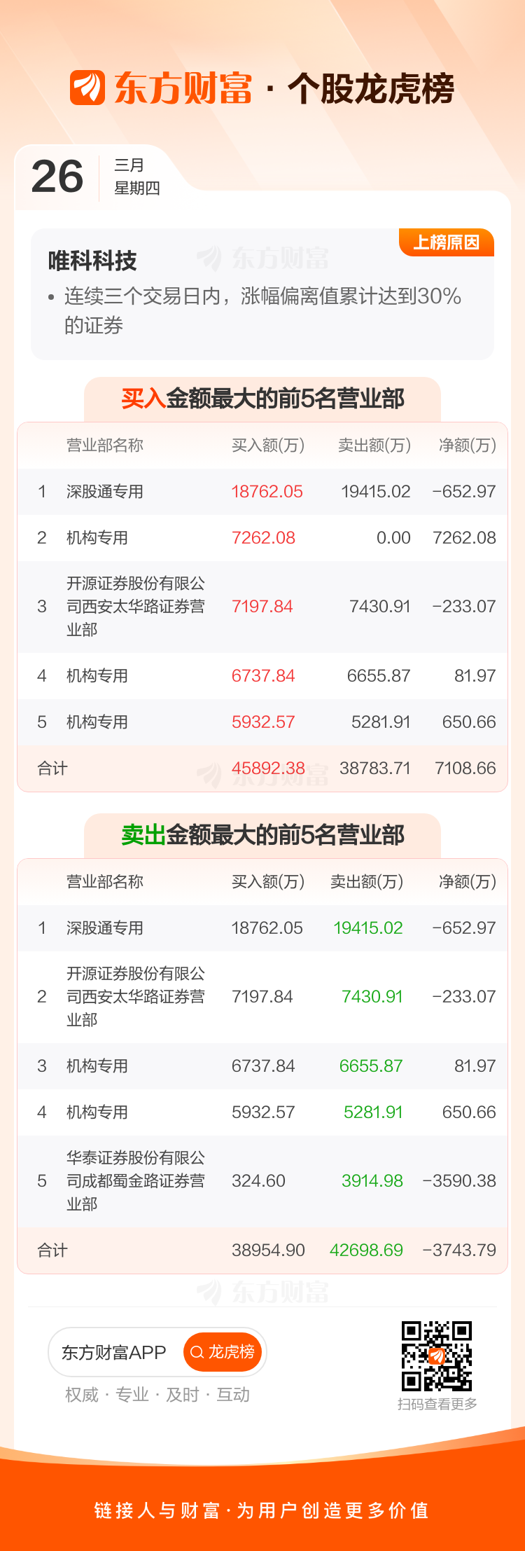 交易所2026年3月26日公布的交易公开信息显示,唯科科技因成为连续三个交易日内,涨幅偏离值累计达到30%的证券上榜。唯科科技当日收报114.25元,涨跌幅3.71%,换手率15.72%,成交额14.56亿。异常期间3月24日至3月26日,期间涨幅33.92%,累计偏离值31.85%,区间成交额31.86亿。