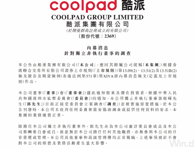 公告显示,酷派集团已收到相关委员会的通知,截至目前未收到要求协助调查或提供资料的要求,公司其他董事和高级管理层均正常履职,集团业务运营正常,预计该事项不会对公司的经营及业务活动产生重大影响。