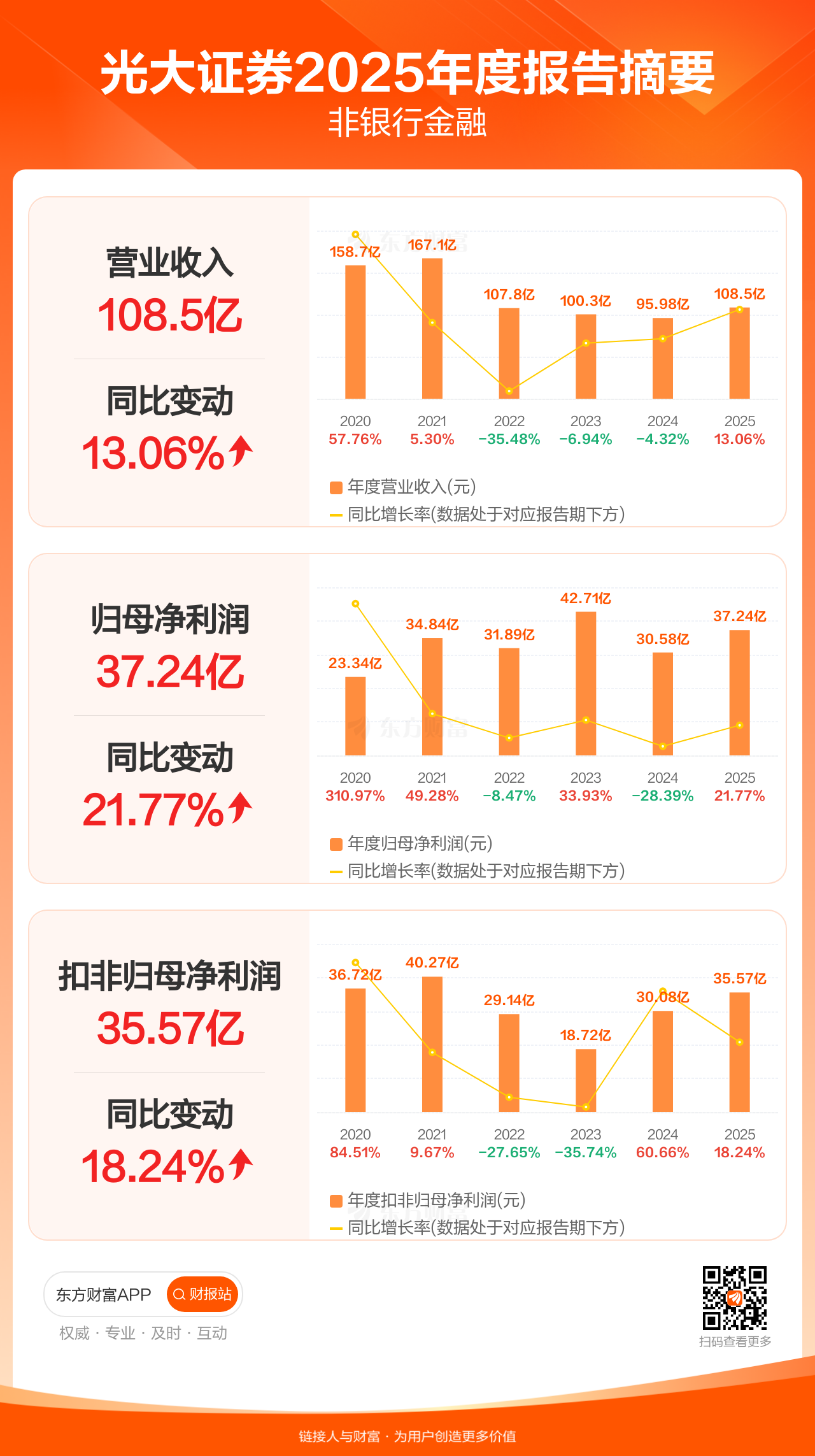 光大证券3月27日发布2025年年报显示,公司全年实现营业收入108.52亿元,同比增长13.06%;归母净利润37.24亿元,同比增长21.77%;扣非归母净利润35.57亿元,同比增长18.24%。每股EPS0.73元,低于机构一致预测的0.88元。