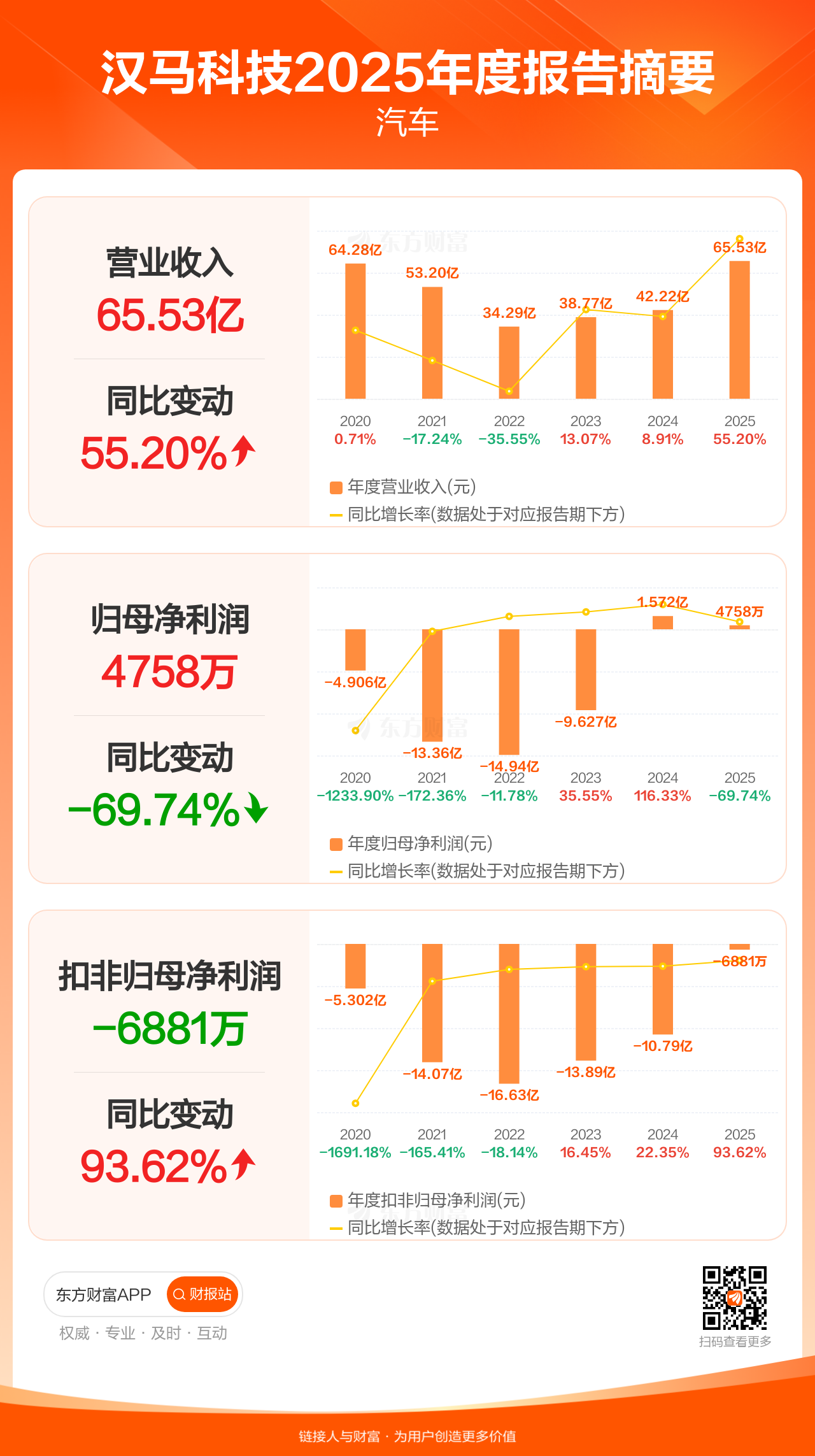 汉马科技3月27日发布2025年年报显示,公司全年实现营业收入65.53亿元,同比增长55.20%;归母净利润4757.91万元,同比下滑69.74%;扣非归母净利润-6880.56万元。