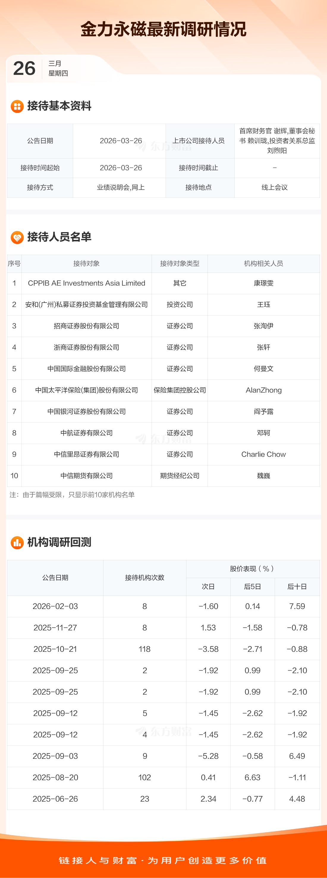 金力永磁3月26日公告称,3月26日接待CPPIB AE Investments Asia Limited等112家机构调研。接待人员包括首席财务官 谢辉,董事会秘书 赖训珑,投资者关系总监 刘煦阳。