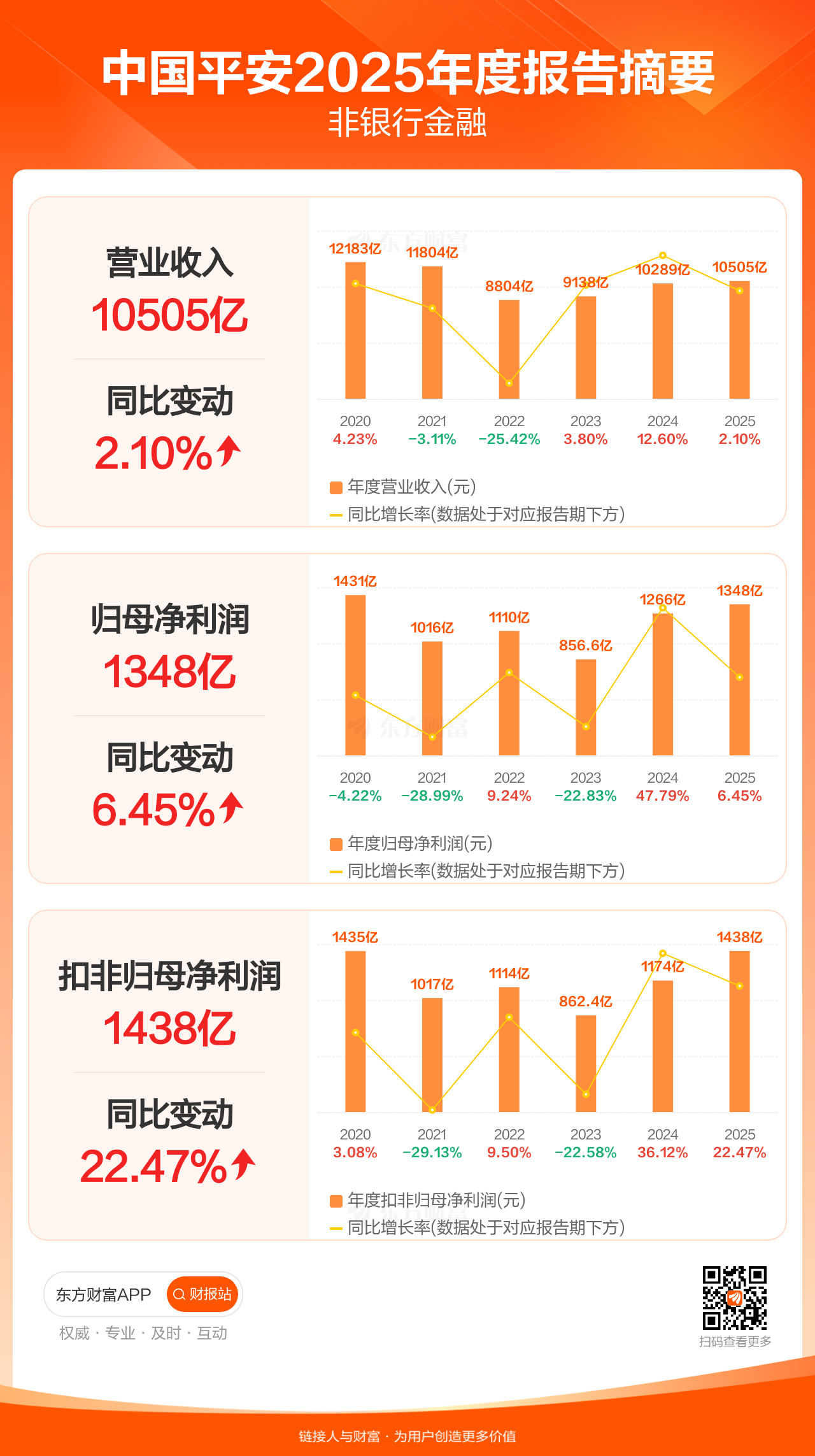 中国平安3月27日发布2025年年报显示,公司全年实现营业收入1.05万亿元,同比增长2.10%;归母净利润1347.78亿元,同比增长6.45%;扣非归母净利润1437.73亿元,同比增长22.47%。