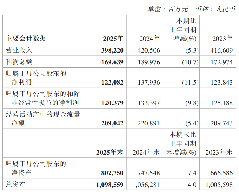 其中第四季度,公司营业收入为857.2亿元,同比下降9.3%;归母净利润为201.1亿元,同比下降5.5%;扣非净利润为194.6亿元,同比上升11.0%。