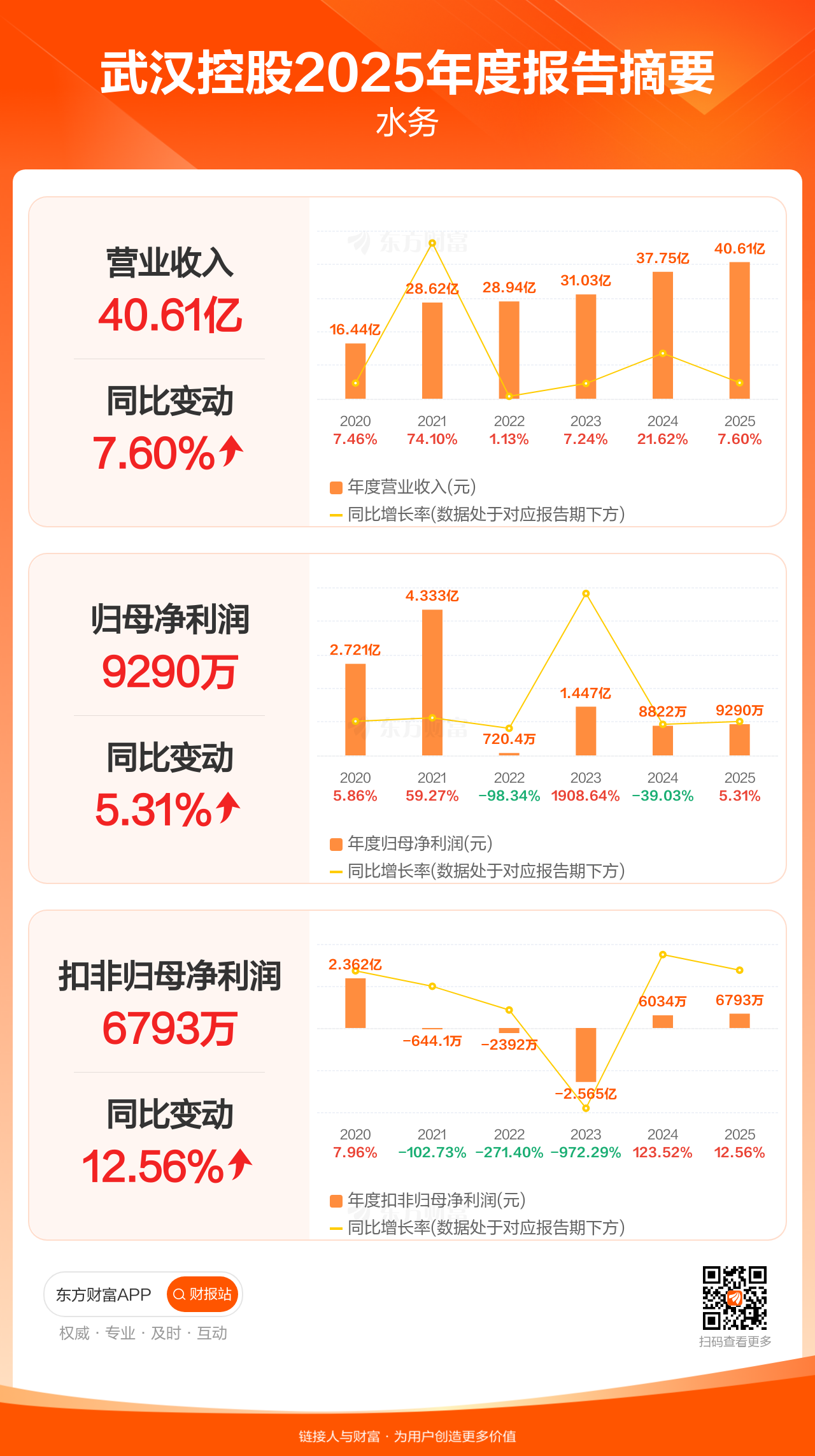 武汉控股3月27日发布2025年年报显示,公司全年实现营业收入40.61亿元,同比增长7.60%;归母净利润9290.36万元,同比增长5.31%;扣非归母净利润6792.63万元,同比增长12.56%。