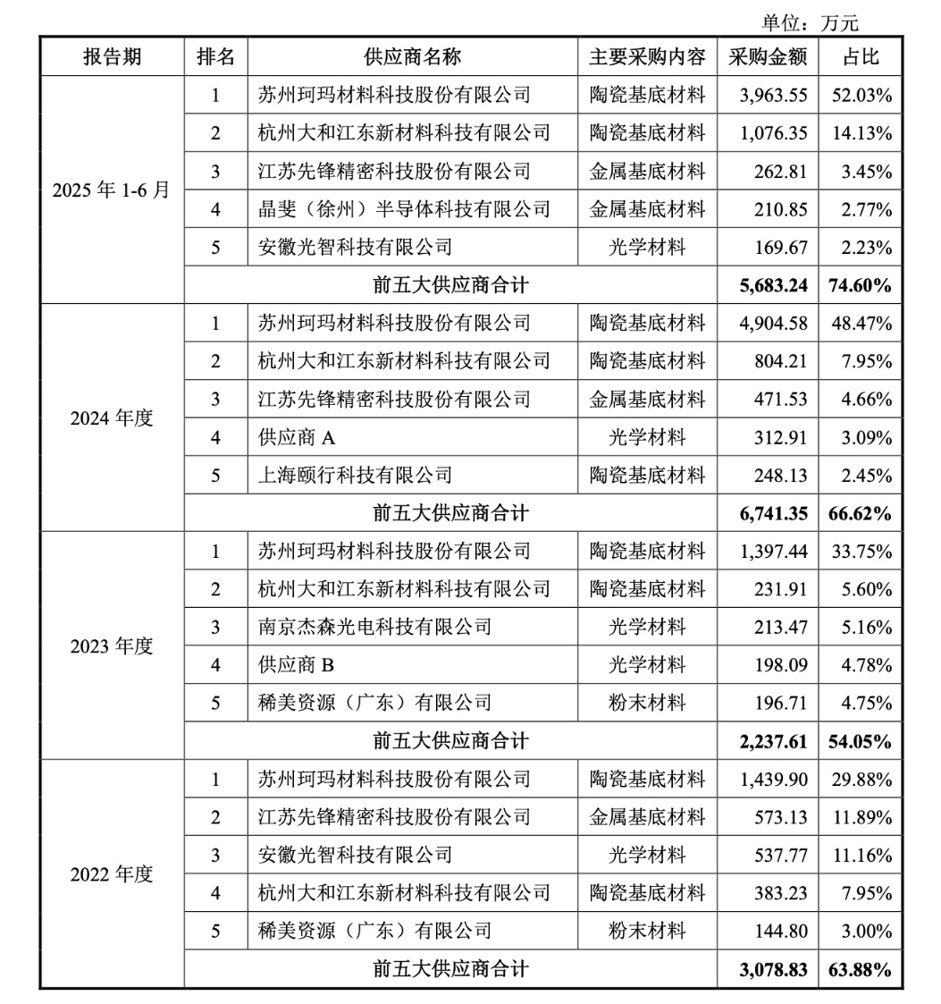在上游供应链端,超纯股份同样存在严重依赖。报告期内,珂玛科技一直是公司的第一大供应商,报告期内采购金额分别为1440万元、1397万元、4905万元和3964万元,占比分别为29.88%、33.75%、48.47%和52.03%,构成对单一供应商的重大依赖。