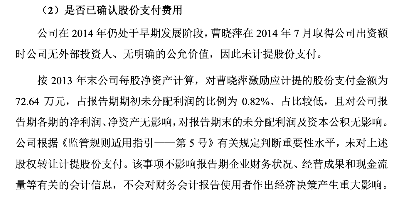 其一,根据《企业会计准则第11号——股份支付》,企业向员工授予股权,若授予价格低于公允价值,差额应确认为股份支付费用。超纯股份在问询回复中承认,按2013年末公司每股净资产计算,曹晓萍所获5%股权对应的公允价值为72.64万元。但这笔股权转让并没有计提股份支付费用,公司对此的解释是“2014年无外部投资人、无明确公允价值”。