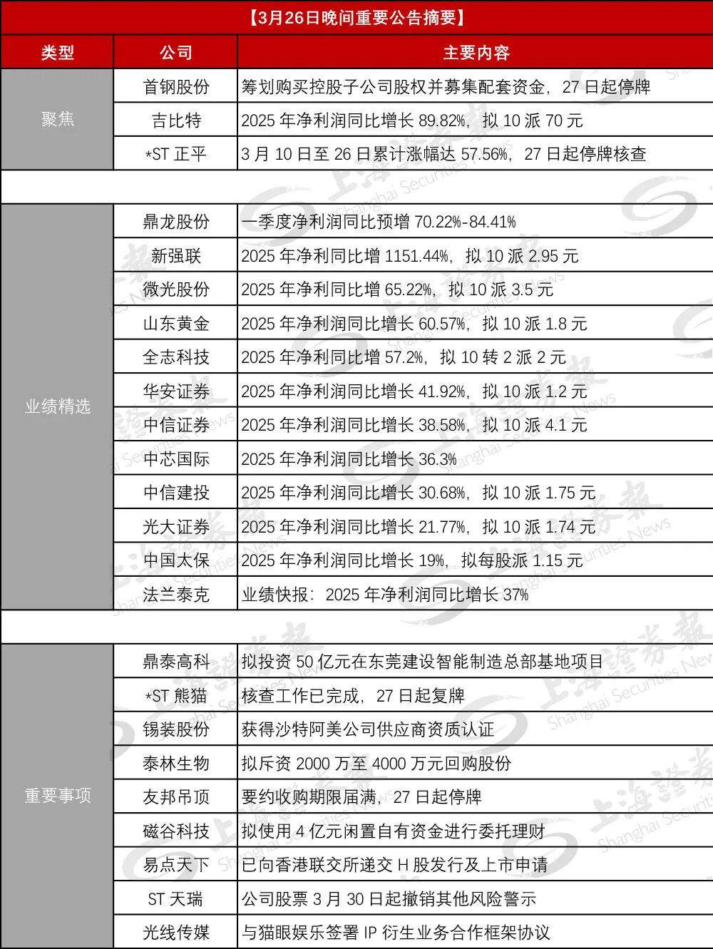 山东黄金:披露年报。公司2025年实现营业收入104,287,391,583.12元,同比增长26.38%;归属于上市公司股东的净利润4,739,393,120.72元,同比增长60.57%;基本每股收益0.94元。公司拟向全体股东每10股派发现金红利人民币1.80元。
