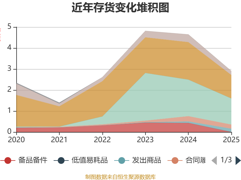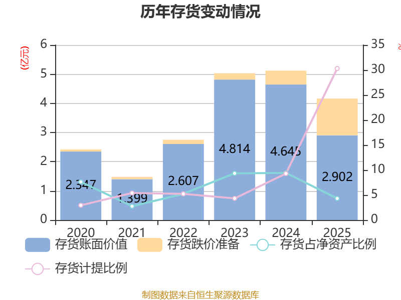 从存货变动来看,截至2025年末,公司存货账面价值为2.9亿元,占净资产的4.31%,较上年末减少1.74亿元。其中,存货跌价准备为1.26亿元,计提比例为30.3%。