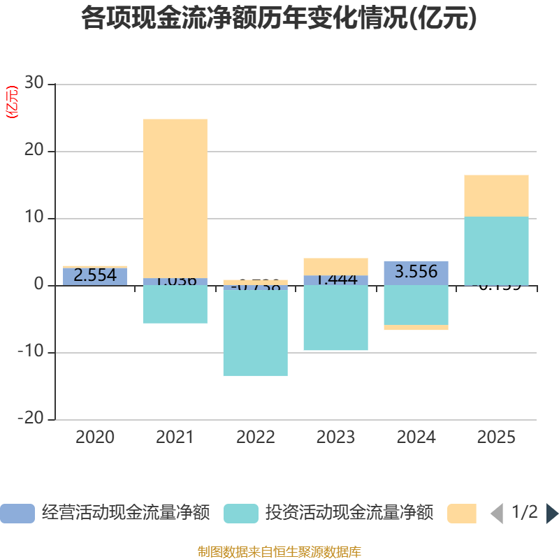 截至2025年,公司经营活动现金流净额为-1390.68万元,同比减少3.7亿元;筹资活动现金流净额6.19亿元,同比增加6.93亿元;投资活动现金流净额10.21亿元,上年同期为-5.94亿元。